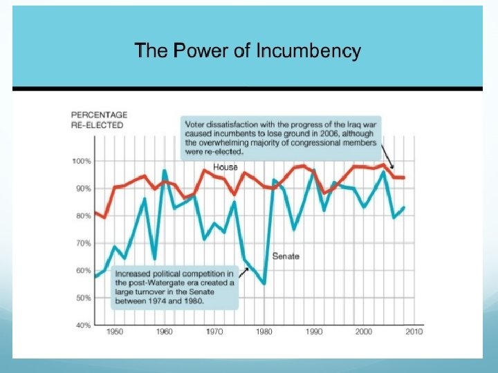 Benefits to Incumbents Name Recognition Apathy Media Coverage- More exposure They’ve already won once: already had support from their base Data Trusts Gerrymandering Vote a “straight party ticket” Money Already met with lobbyists Support from colleagues already in office- favors Record: Clear issues based on voting record