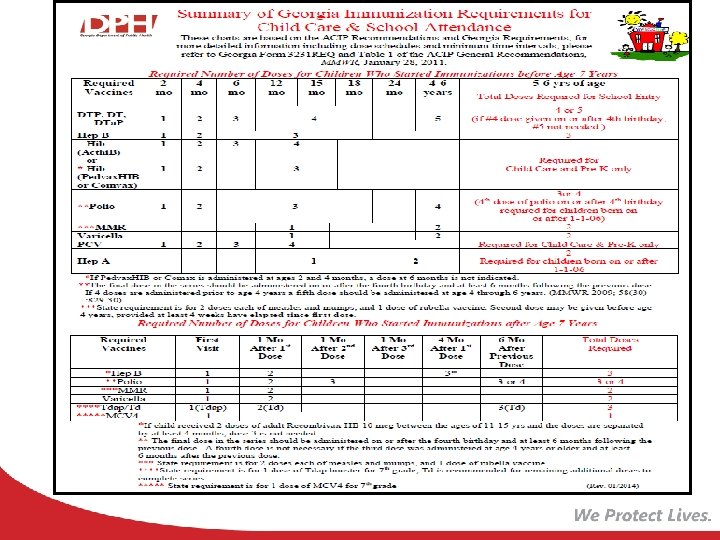 DPH Rules and Regulations • Provide definition of terms • Stipulate the specific requirements – List required vaccines or – Acceptable proof of immunity – Define medical and religious exemptions • Provide directions for issuing, maintaining, and inspecting certificates GA Rules and Regulations updated for the 2014 -2015 school year to reflect the new school requirements. (511 -2 -2)