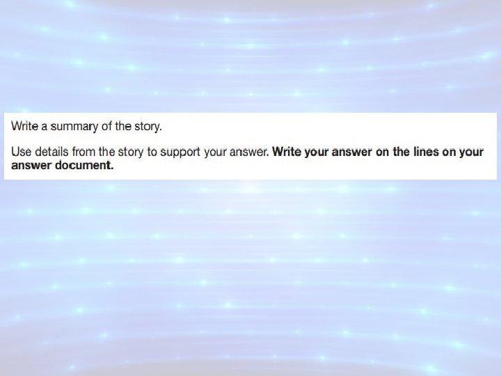 Narrative Response • What is it? – writing based on a fiction passage – 2 -3 paragraphs – directly relates to the story you just read – worth 4 points • How do I recognize it? – it does not ask you to answer a question! – this asks you to do something specifically related to the fiction story you just read • write a conclusion, rewrite a part, write a new ending, etc.
