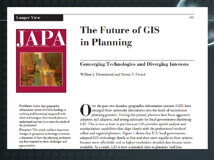 Questions for thought and discussion • Is geographic information science really a science? • Is GIS “just a tool like MS-Word” and planners should not offer GIS courses or planning-based GIS specializations/certificates? • City planning involves fundamental normative values such as sustainability, justice, and resilience. How compatible is geographic information science with ethical values such as sustainability?