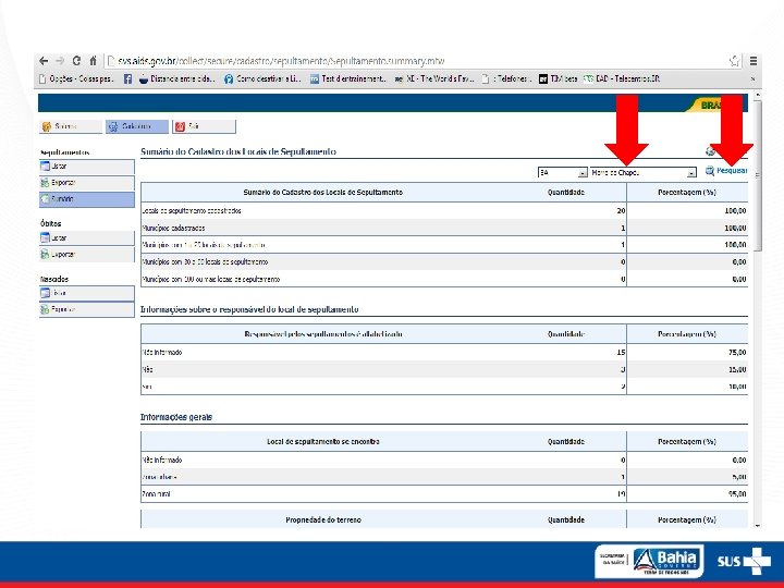 ETAPA 1 Municípios cadastrados na Bahia: 194 • 172 possuem 1 a 29 locais de sepultamento • 16 possuem 30 a 99 locais de sepultamento • 6 possuem 100 ou mais locais de sepultamento Locais de sepultamentos Cadastrados: 3. 201 • 69, 1 % foram classificados com não oficiais; • 46, 9% estão em terrenos privados; • 57, 9% não dispõem de muros; • 87, 4% estão na zona rural; • 74, 8% não realizam registro do sepultamentos; • 50, 6% não exige algum documento como condição para realização do sepultamento. • 12, 5% dos cemitérios cadastrados no Portal SVS Collect tem foto.