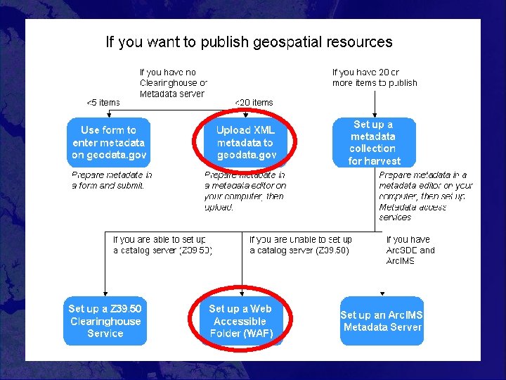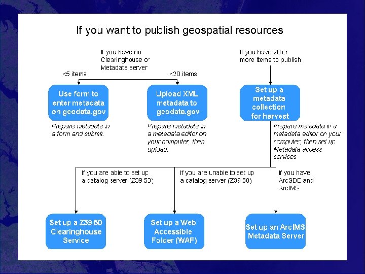 What is metadata harvesting? • Metadata harvesting is an automated scheduled process for collecting new and updated metadata from a wide variety of GIS metadata sources. • The process of harvesting allows geodata. gov to synchronize its metadata with publishers metadata. • If you participate in metadata harvesting, any update to your metadata should be made on your metadata repository. geodata. gov will obtain the update through harvesting.