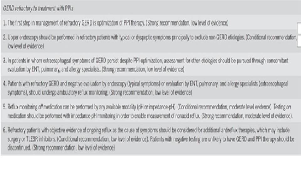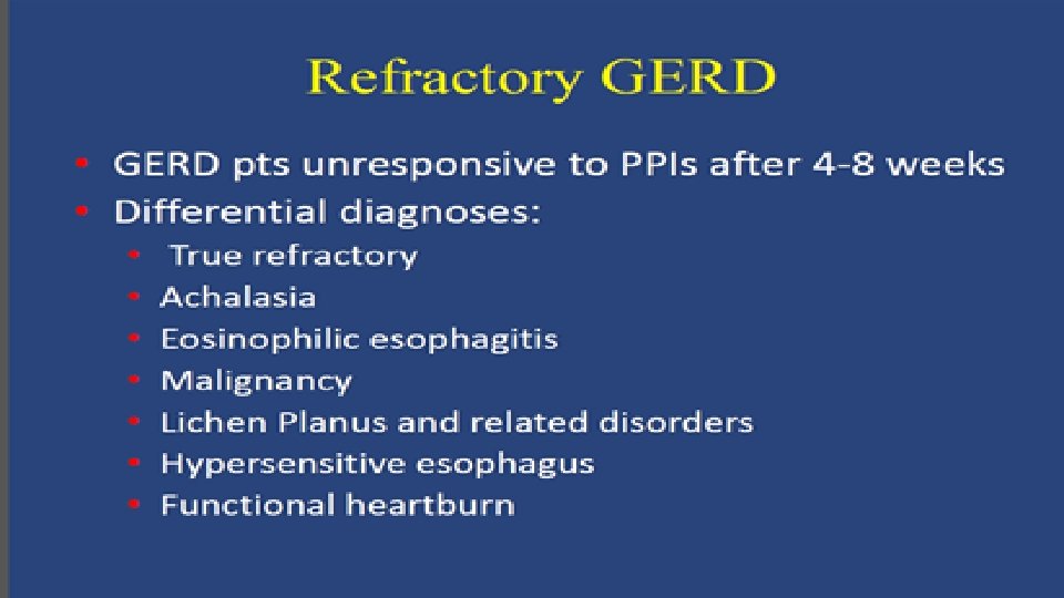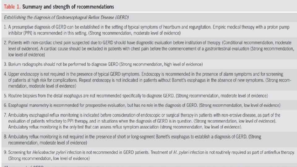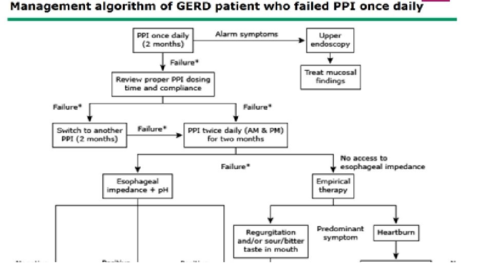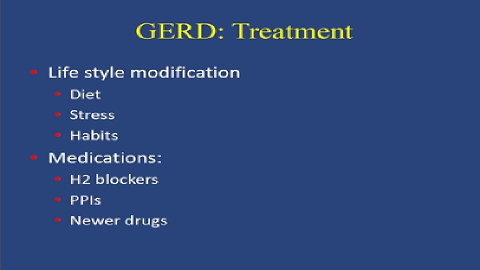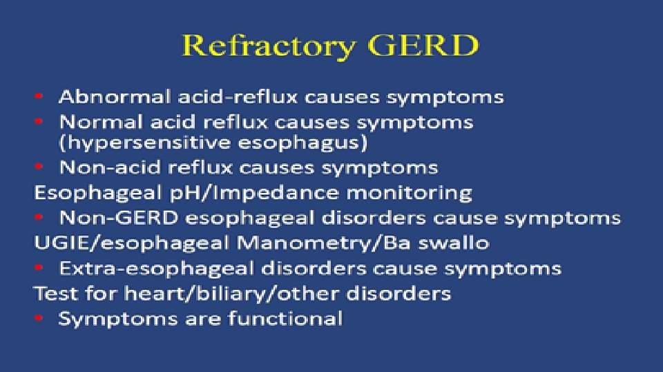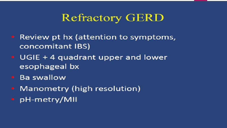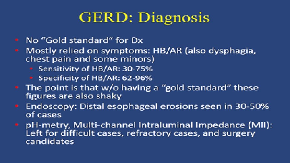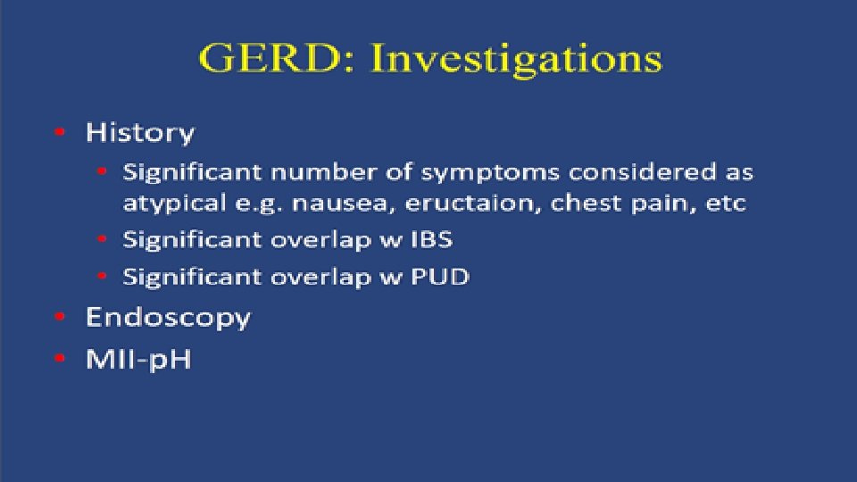 Endoscopy - To exclude mucosal injury in: Atypical symptoms Unresponsive to treatment - Alarm factors: Dysphagia weight loss Recurrent occult or gross bleeding vomiting Jaundice Lymphadenopathy palpable mass family history of GI malignancy Unexplained dyspepsia Screen Barrett`s metaplasia: Heartburn >5 yrs duration especially in patients >50 yrs