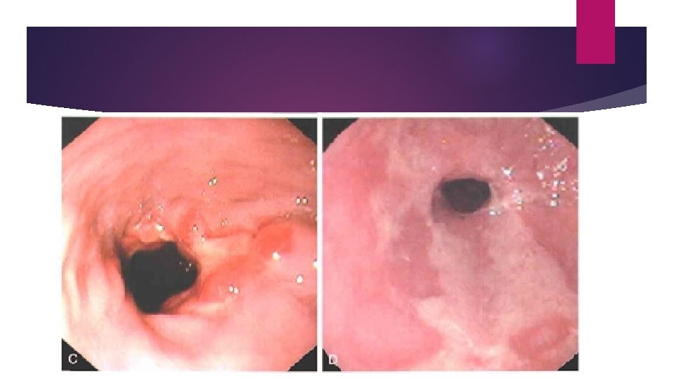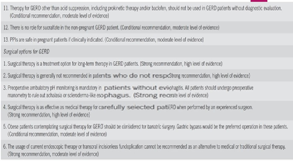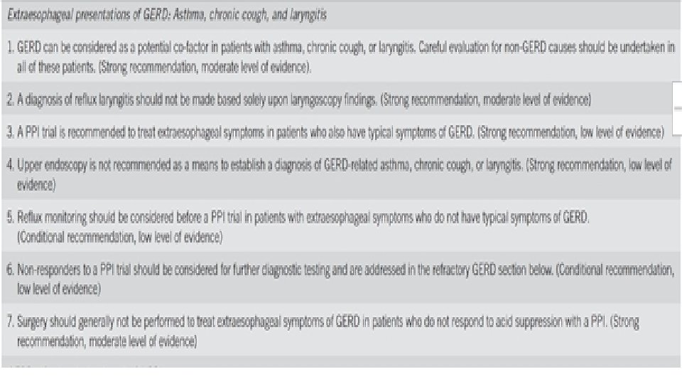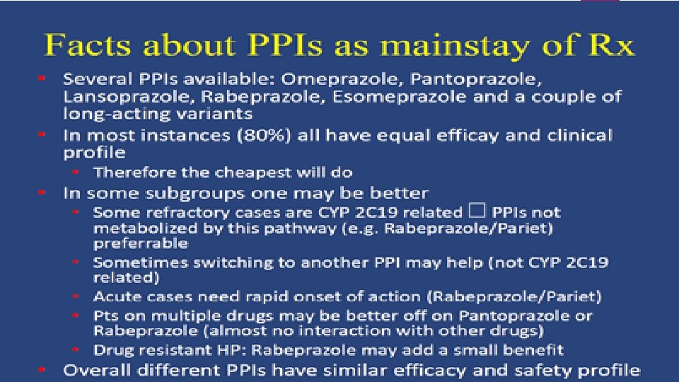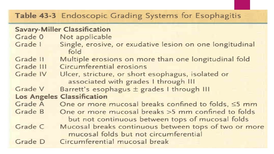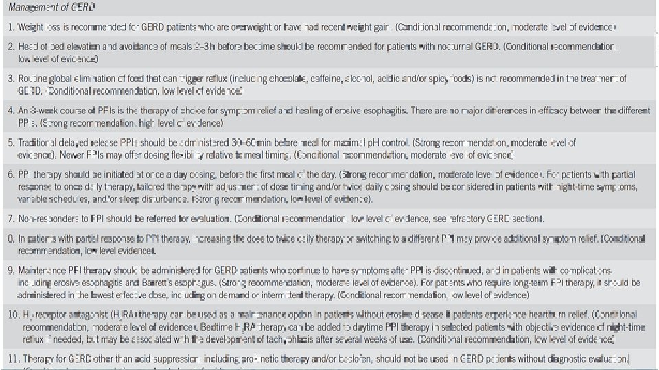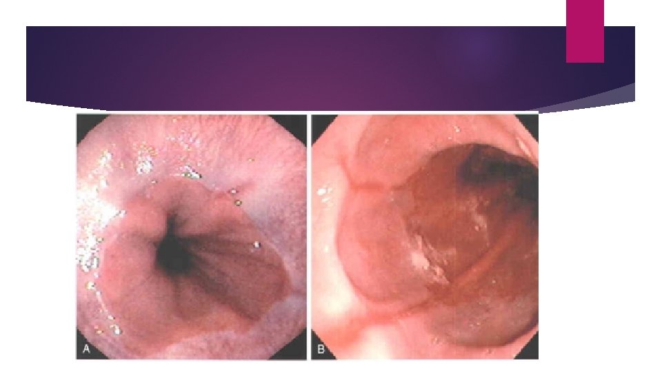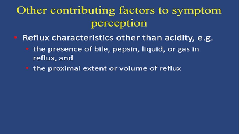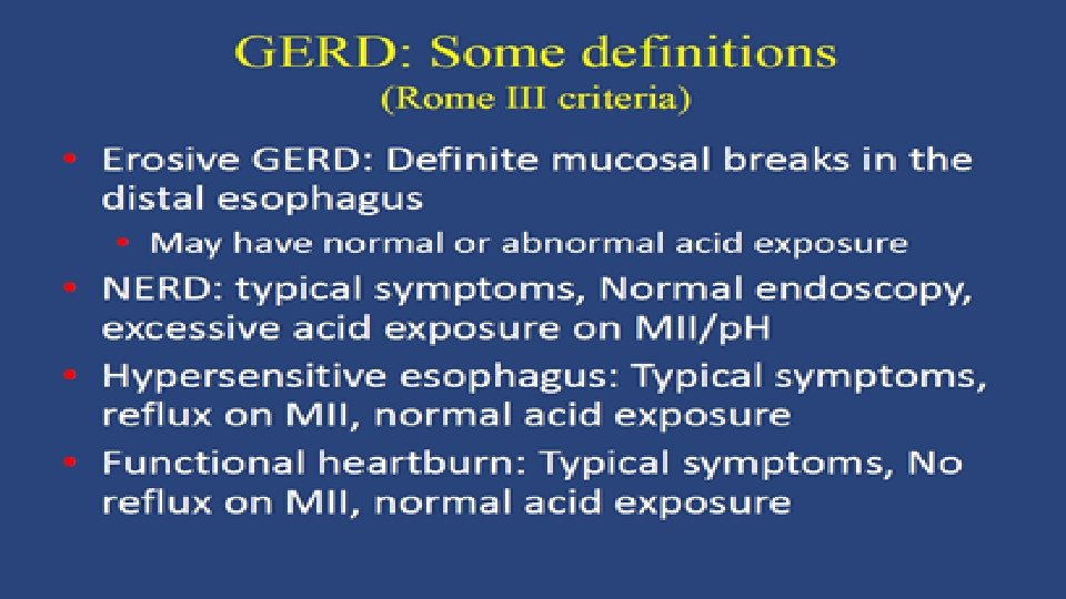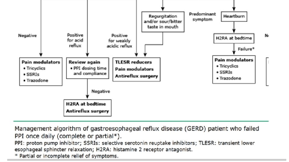 Endoscopy - To exclude mucosal injury in: Atypical symptoms Unresponsive to treatment - Alarm factors: Dysphagia weight loss Recurrent occult or gross bleeding vomiting Jaundice Lymphadenopathy palpable mass family history of GI malignancy Unexplained dyspepsia Screen Barrett`s metaplasia: Heartburn >5 yrs duration especially in patients >50 yrs
