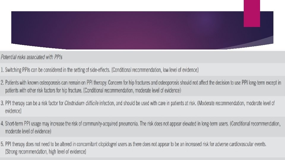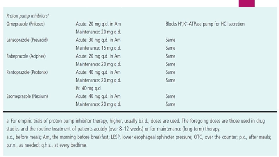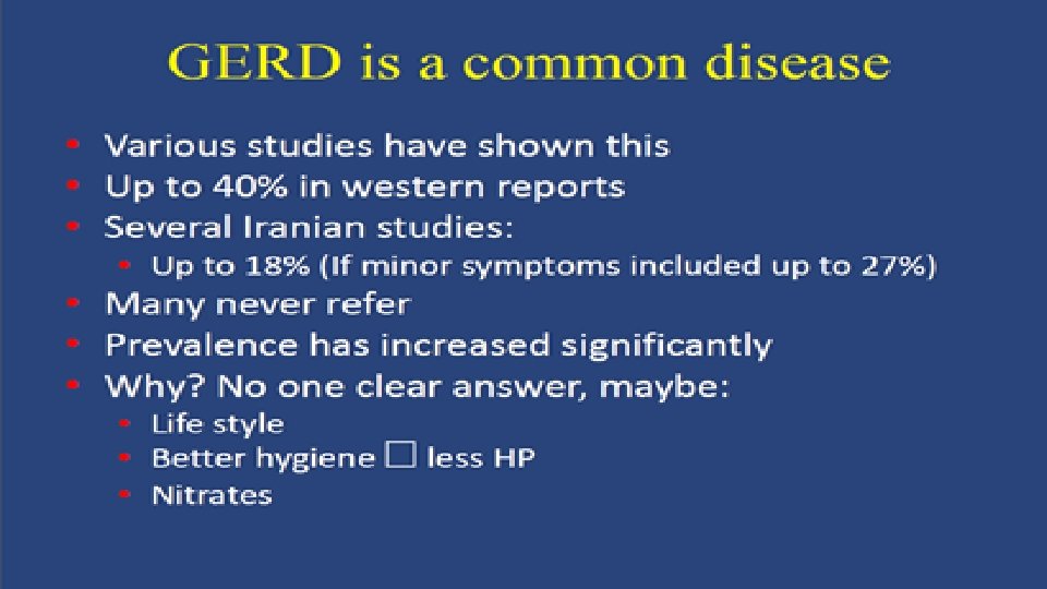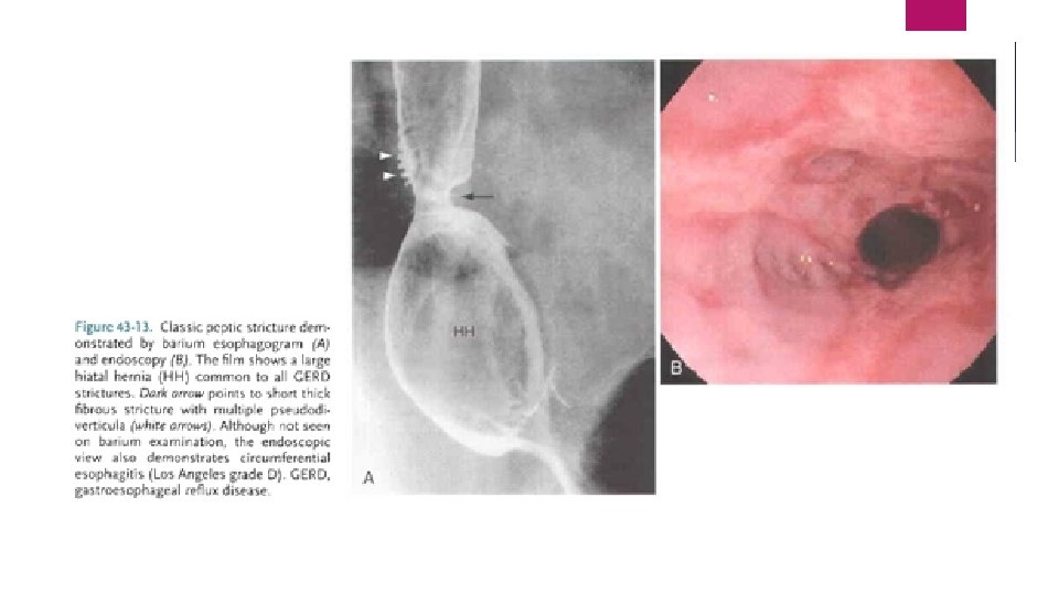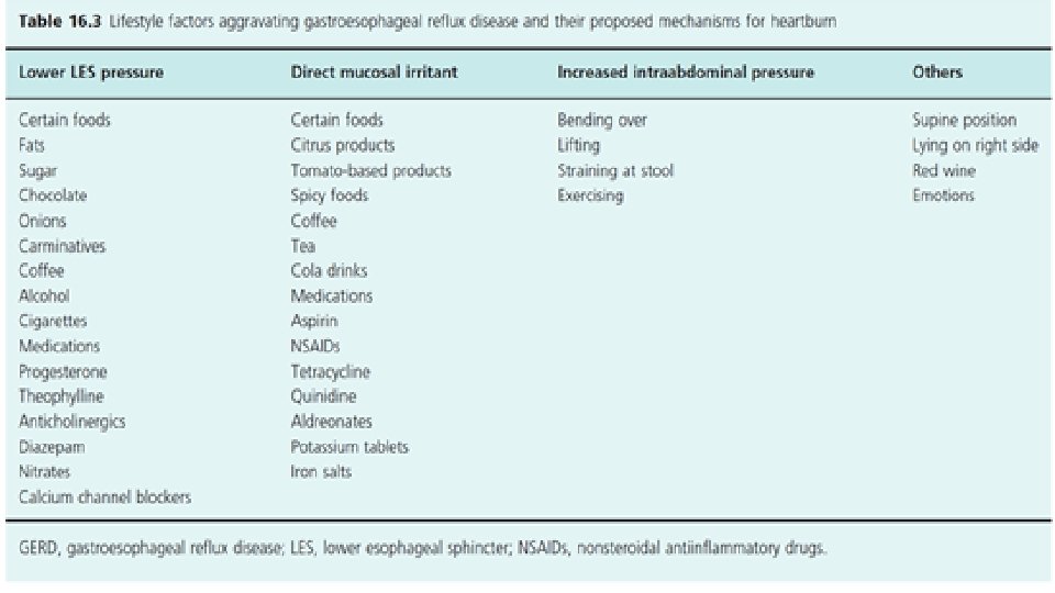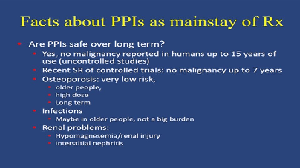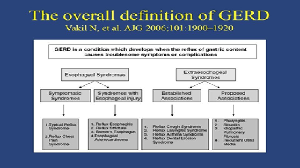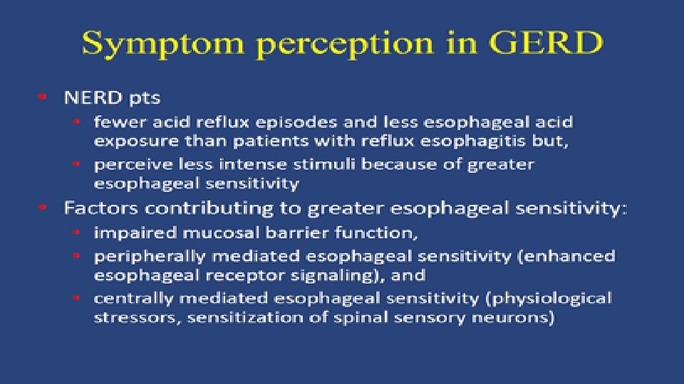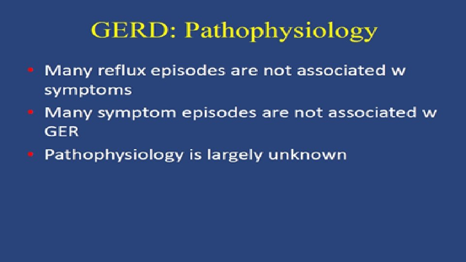 Endoscopy - To exclude mucosal injury in: Atypical symptoms Unresponsive to treatment - Alarm factors: Dysphagia weight loss Recurrent occult or gross bleeding vomiting Jaundice Lymphadenopathy palpable mass family history of GI malignancy Unexplained dyspepsia Screen Barrett`s metaplasia: Heartburn >5 yrs duration especially in patients >50 yrs
