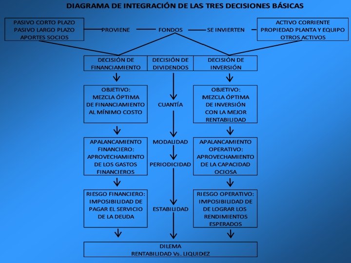 La administración financiera de las empresas estudia tres aspectos: La inversión en activos reales (inmuebles, equipo, inventarios, etc); la inversión en activos financieros (cuentas y documentos por cobrar), y las inversiones de excedentes temporales de efectivo. La obtención de los fondos necesarios para las inversiones en activos. Las decisiones relacionadas con la reinversión de utilidades y el reparto de dividendos. UNI Norte