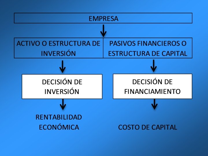 La administración financiera de las empresas estudia tres aspectos: 1. - La inversión en activo reales, la inversión en activos financieros y las inversiones excedente de efectivo. 2. - La obtención de los fondos necesarios para las inversiones en activos. 3. - Las decisiones relacionadas con la reinversión de las utilidades y el reparto de dividendos. UNI Norte