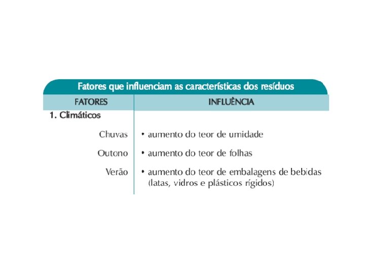 Características físicas • Geração per capita; • Composição gravimétrica; • Peso específico aparente; • Teor de umidade; • Compressividade.