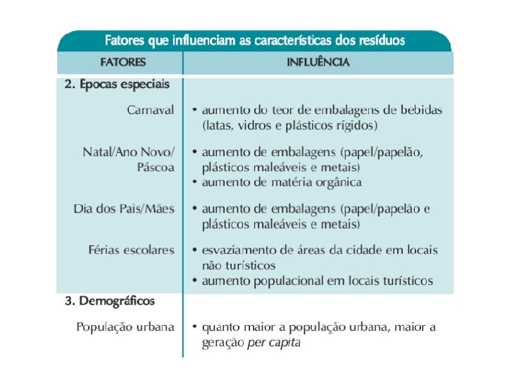 GERAÇÃO PER CAPITA Relaciona a quantidade de resíduos urbanos gerada diariamente e o número de habitantes de determinada região. Faixa de variação média para o Brasil: de 0, 5 a 0, 8 kg/hab. /dia Importância: • Fundamental para projetar as quantidades de resíduos a coletar e a dispor. • Importante no dimensionamento de veículos. • Elemento básico para a determinação da taxa de coleta, bem como para o correto dimensionamento de todas as unidades que compõem o Sistema de Limpeza Urbana.
