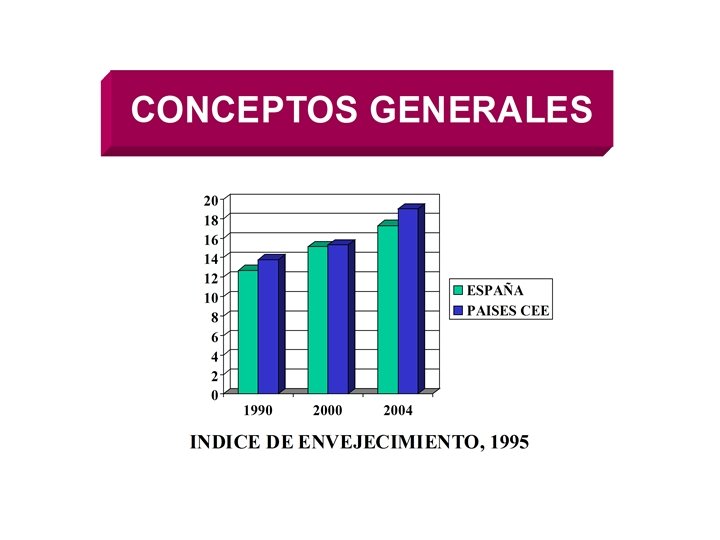 EPIDEMIOLOGIA PERSONAS MAYORES • Esperanza vida máxima : 120 años • Esperanza vida media : 77 años varones 83 años mujeres De vida independiente : 60 % de los años estimados a partir de los 65 años. 60% de 12 años (varones), o de 18 años (mujeres)