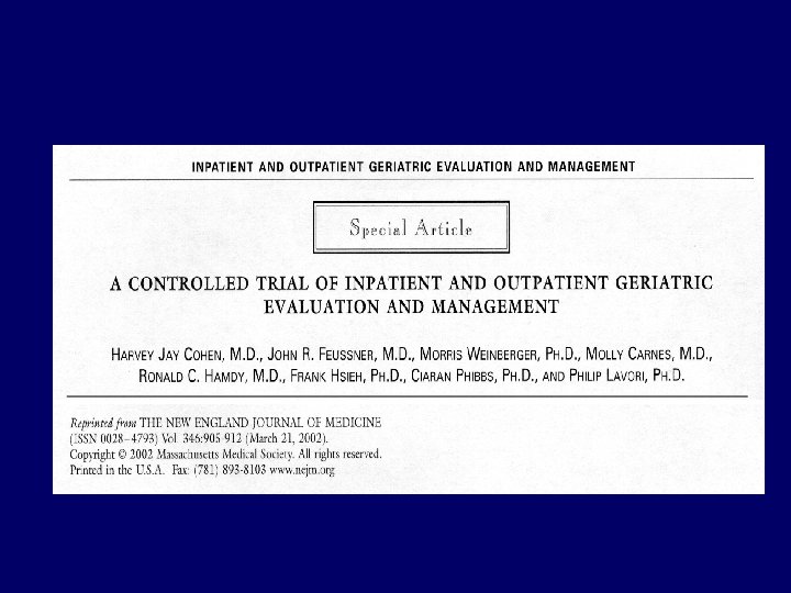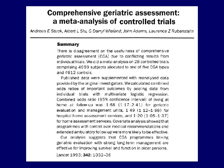CGA Patients • More likely alive and at home 1. 16 (1. 05 -1. 28) p=. 003 • Less likely in residential care 0. 78 (. 69 -. 88) p= <. 001 • Less likely to experience deterioration 0. 76 (. 68 -. 90) p=. 001 Ellis G. et al, BMJ 343: 1 -10, 2011