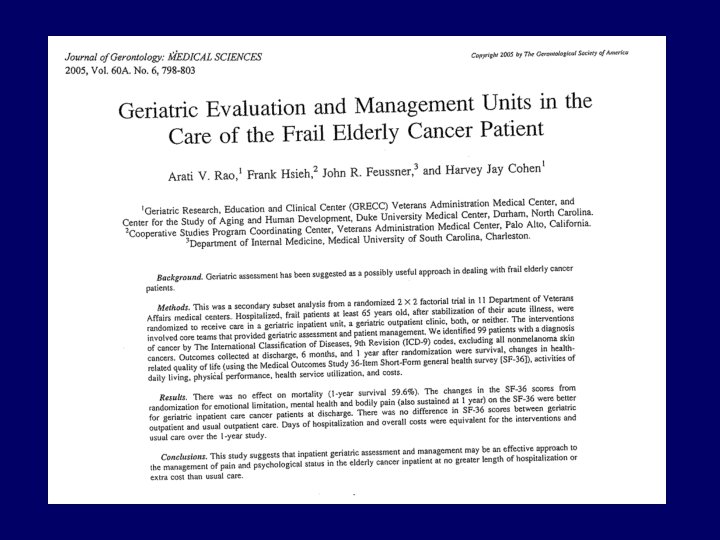 CONCLUSIONS • Impressive and sustained effect on bodily pain • Positive effect on emotional limitations and mental health parameters • No effect of GEMU on overall survival and mortality • No difference in costs between GEMU and usual care of cancer patients Rao, JGMS, 60 A: 798, 2005