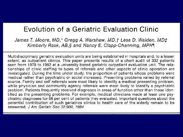 GEM Early Stirrings • Models of Geriatric Care in UK in 30’s-40’s • US awareness – 1970’s; elderly complex, multifaceted issues • Many issues not uncovered in routine evaluation - Kanes’ book – 1981 • Hospitalized older patients at risk for Functional Decline