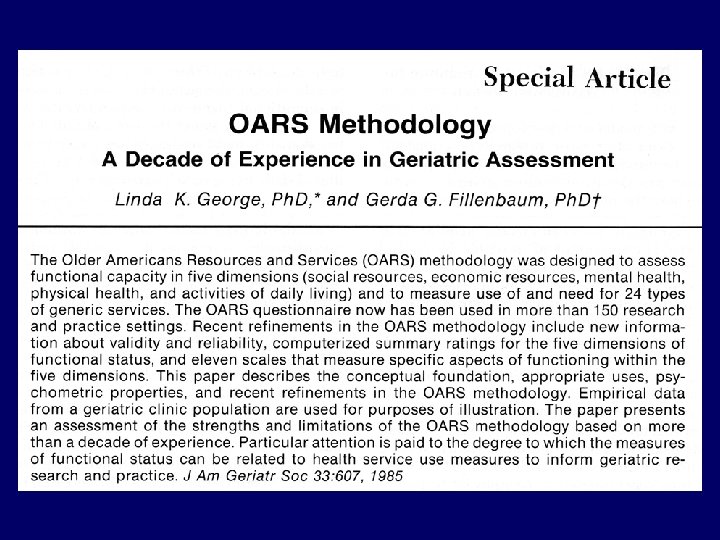 GERIATRIC ASSESSMENT MEASURES SELECTED BASED ON RELIABILITY, VALIDITY, BREVITY AND PROGNOSTIC VALUE Domain Measures ______________________________ Functional Status ADL of MOS Physical Health Scale IADL {Subscale of the OARS} Karnofsky Performance Status {Physician-Rated} Karnofsky Performance Status {Patient-Rated} Timed Up and Go Number of Falls in Last 6 Months Comorbidity Physical Health Section {Subscale of the OARS} Cognition Blessed Orientation-Memory-Concentration Test Psychological Hospital Anxiety and Depression Scale Social Functioning MOS Social Activity Limitations Measure Social Support MOS Social Support Survey: Emotional/Information and Tangible Subscales Seeman and Berkman Social Ties Nutrition Body Mass Index % Unintentional Weight Loss in Last 6 Months Medications List Prescribed, Herbal, OTC Hurria, Crit Rev Onc/Hem 59: 211, 2006
