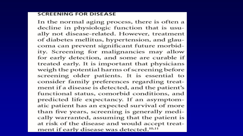 Comprehensive Geriatric Assessment • An interdisciplinary approach to the evaluation of older persons’ physical and psychosocial impairments and their functional disabilities • 3 -step process: 1. Targeting appropriate patients 2. Assessing patients and developing recommendations 3. Implementing recommendations