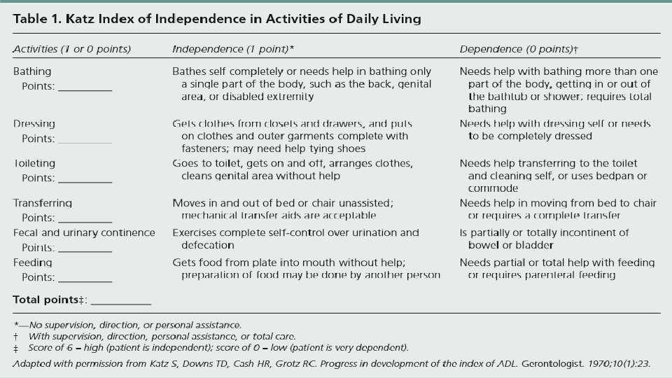 Comprehensive Geriatric Assessment KATZ INDEX OF ACTIVITIES OF DAILY LIVING • Bathing • Dressing • Toileting • Transfer • Continence • Feeding Independent Assistance Dependent Katz S et al. Studies of Illness in the Aged: The Index of ADL; 1963.