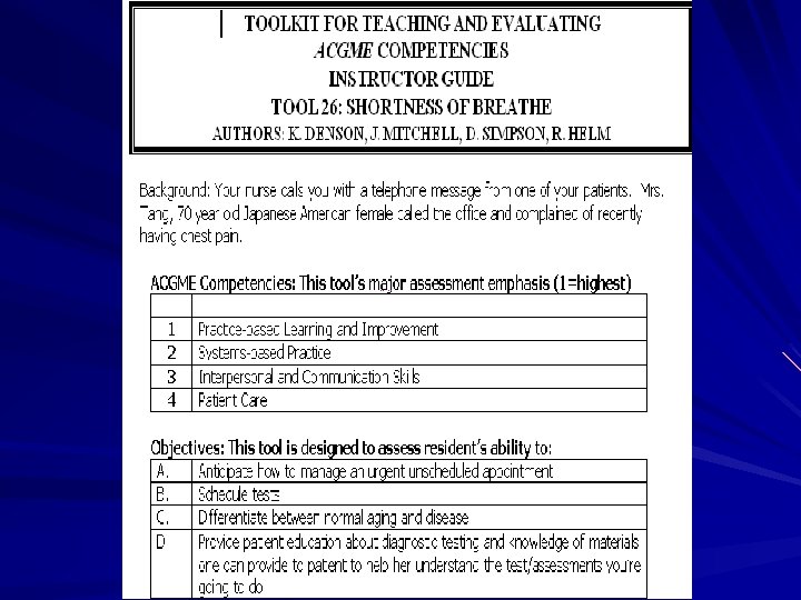 Video OSCEs Improves interest by incorporating video clips and patient cases Stimulates discussion on a variety of topics pertinent to Family Medicine and care of the geriatric patient Documents ACGME competency instruction and evaluates residents Identifies areas in need of further education 1 VOSCEs used for 1 -hour session, or segments incorporated into lecture