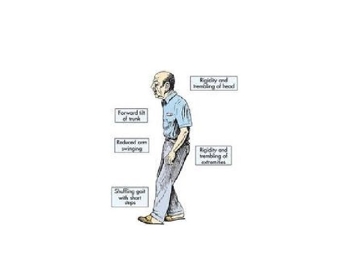 Parkinson’s Disease • Any combination of six independent motoric features: • 1. Rest tremor • 2. Bradykinesia • 3. Rigidity • 4. Loss of postural reflexes • 5. Flexed posture • 6. Freezing phenomenon( Feet glued to the ground)