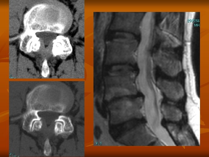 Spodylarthrosis n n n A kisizületek a csigolyák hátsó részeit kötik össze A fájdalmat degeneráció és arthritis (izületi gyulladás) okozza A fájdalom lokalizált és nem kisugárzó jellegű Meszes felrakódások gyakran képződnek MR és CT egyaránt mutatja a degenerációt. Scintigráfián fokozottabb dúsulás