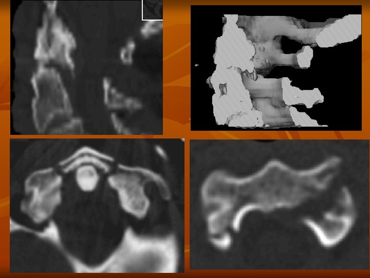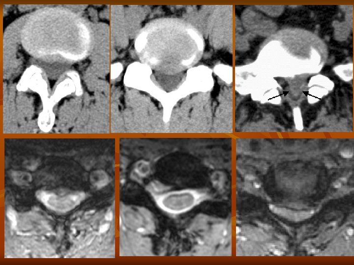 INDIKÁCIÓK n n Komputertomográfia (CT) - max. 3 szegmens! n Fejlődési rendellenességek: csont / canalis spinalis n gyulladások: csont / discus n degeneratív elváltozások: spondylarthrosis, discus hernia n trauma: csont, epi - subduralis haematoma n tumorok: csont elváltozások Myelo-CT n trauma: duralis és radicularis sérülések n stb.