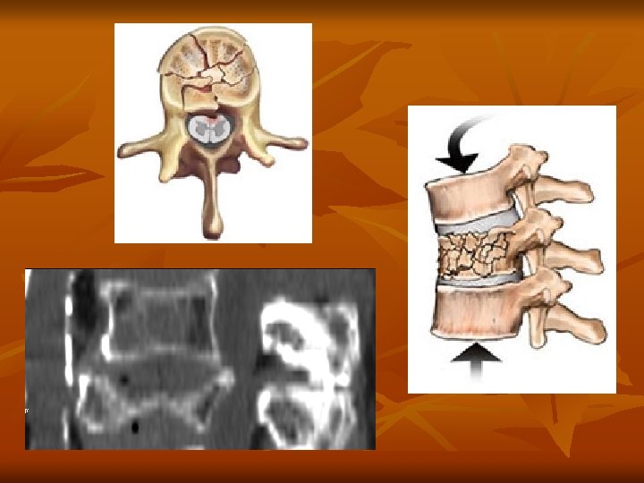 Törések n n n Kompressziós törés Hajlitásos, kompressziós törés Hajlitásos, disztrakciós törés Kompressziós, torziós törés Gerinc instabilitás és neurologiai defektusok Csigolyatest, iv törés