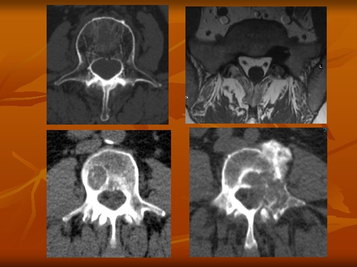 Daganatok n n n n n Ritka, de súlyos kórkép Jó és rosszindulatú daganat Fájdalom, mely nem specifikus Csontszerkezet destrukciója, instabilitás Myelon és ideggyök kompresszió Patológiás törés Rtg CT és MR Scintigráfia