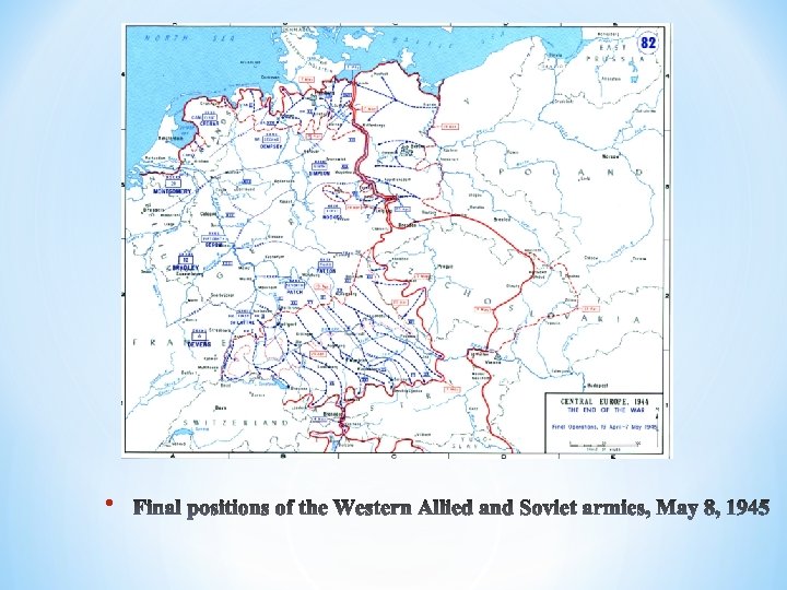 • • Germany divided into four ocuppation zones – French in the southwest, British in the northwest, United States in the south, and Soviet in the east, also Berlin, which was situated in the Soviet zone, was divided into four occupation zones • All the territorries that Germany had occupied (Austria, Czechoslovakia …) were detached • Germany lost some territories for Poland Russia, new Polish frontiers on the Oder-Niesse line • Millions of ethnic Germans expelled from Czechoslovakia, Poland Hungary returned to Germany