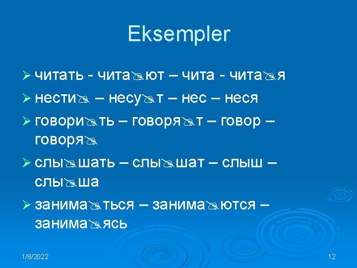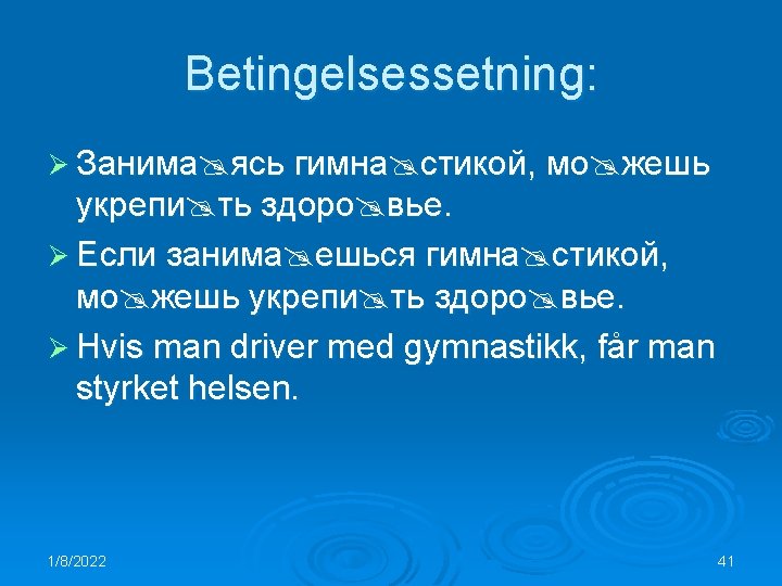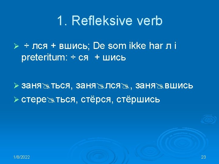 Dannelse forts. Ø Grunnen til at 1. pers. sing. ikke bør brukes for å finne stammen gerundiumssuffikset skal føyes til, er at konsonantendringen som ofte forekommer i 1. p. sing av 2. konjugasjonsverb uteblir i gerundiet. Ø Eks: приноси ть – приношу – прино сят – принося 1/8/2022 14