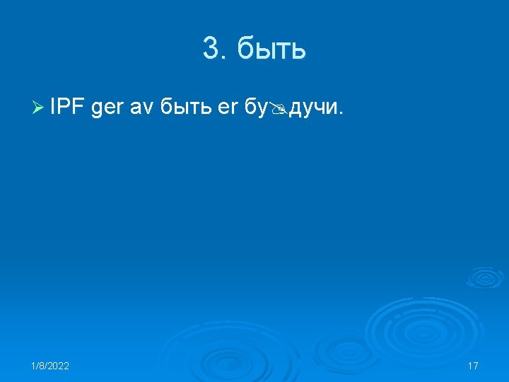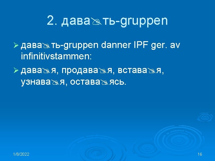 1. De fleste verb Ø De aller fleste IPF ger. dannes av presensstammen med suffikset я: Ø 3. person presens plur. ÷ ут/ют/ят (ат) + я (а der skrivereglene krever det) 1/8/2022 11