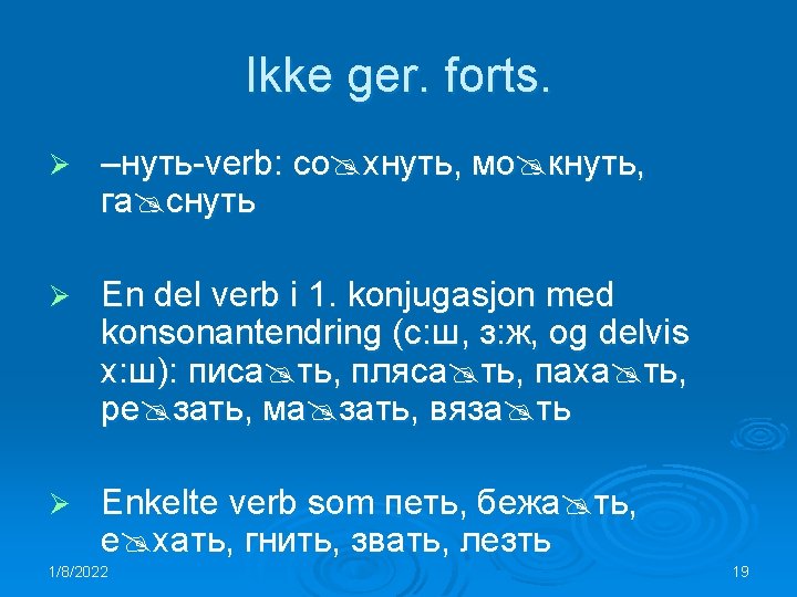 4. Noen verb danner ikke IPF ger. Ø Verb som ikke har vokal i presensstammen: ждать (жд-), рвать ’plukke’ (рв-), тере ть ’gni’ (тр-), пить (пь-), слать (шл-) m. fl. Ø Verb som ender på –чь i infinitiv (dvs. stammen ender på г eller к): печь, жечь, бере чь, мочь m. fl. 1/8/2022 18