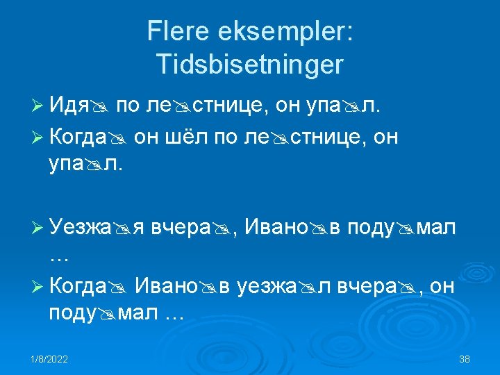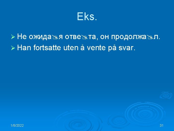 Bruk Ø Так ду мал он, идя домо й. Ø Slik tenkte han mens han gikk hjem. Ø Nektet IPF gerundium oversettes som regel med ”uten å…” Ø Не гля дя на неё, Па вел заговори л. Ø Uten å se på henne begynte Pavel å snakke. 1/8/2022 30