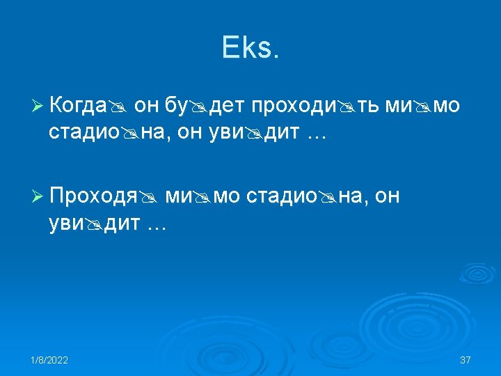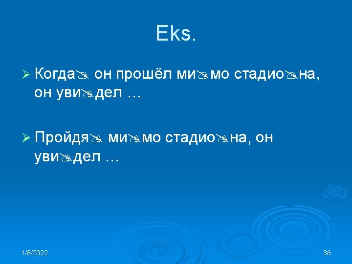 Aspektvalg ved erstatning av leddsetning med gerundialkonstruksjon: Ø Dersom verbet i leddsetningen står i imperfektiv aspekt, velges imperfektivt gerundium. Hvilken tid leddsetningens verb opptrer i er uten betydning for dette spørsmål. Uten betydning for samme spørsmål er også hvilken tid og hvilket aspekt helsetningens verb står i. 1/8/2022 35