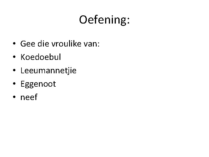 Oefening: • • • Gee die vroulike van: Koedoebul Leeumannetjie Eggenoot neef