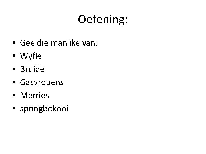 Oefening: • • • Gee die manlike van: Wyfie Bruide Gasvrouens Merries springbokooi