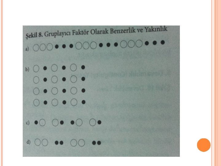 3)Benzerlik( Proximity) İlkesi Şekil, renk, doku, cinsiyet vb. pek çok özellik bakımından birbirine benzer maddeler birlikte gruplanarak algılanma eğilimindedir. Benzerlik faktörü görsel uyarıcıların algılanmasında olduğu kadar, işitsel uyarıcıların algılanmasında da önem taşır.