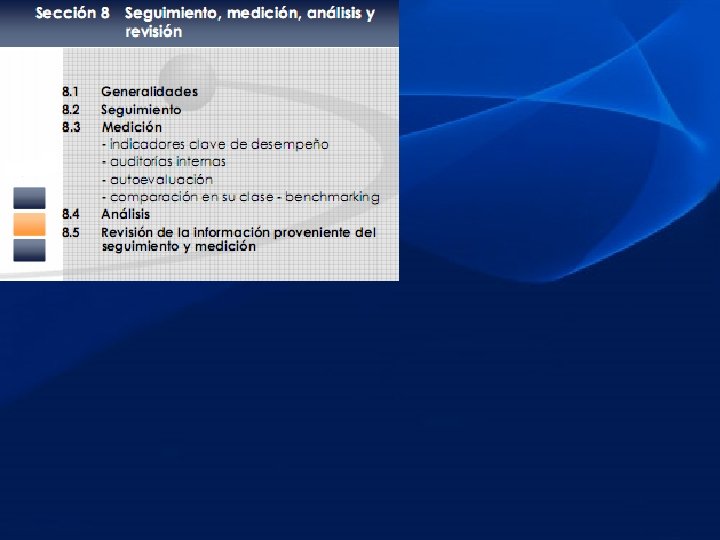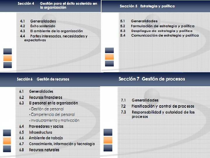 VI. GESTIÓN DE LOS RECURSOS o PROVISIÓN DE RECURSOS. o RECURSOS HUMANOS. o INFRAESTRUCTURA. o AMBIENTE DE TRABAJO. VII. REALIZACIÓN DEL PRODUCTO o PLANIFICACIÓN DE LA REALIZACIÓN DEL PRODUCTO. o PROCESOS RELACIONADOS CON EL CLIENTE. o DISEÑO Y DESARROLLO. o COMPRAS. o PRODUCCIÓN Y PRESTACIÓN DEL SERVICIO POSVENTA. o CONTROL DE LOS DISPOSITIVOS DE SEGUIMIENTO Y DE MEDICIÓN. VIII. MEDICIÓN, ANÁLISIS Y MEJORA o GENERALIDADES. o SEGUIMIENTO Y MEDICIÓN. o CONTROL DE PRODUCTOS NO CONFORME. o ANÁLISIS DE DATOS. o MEJORA.