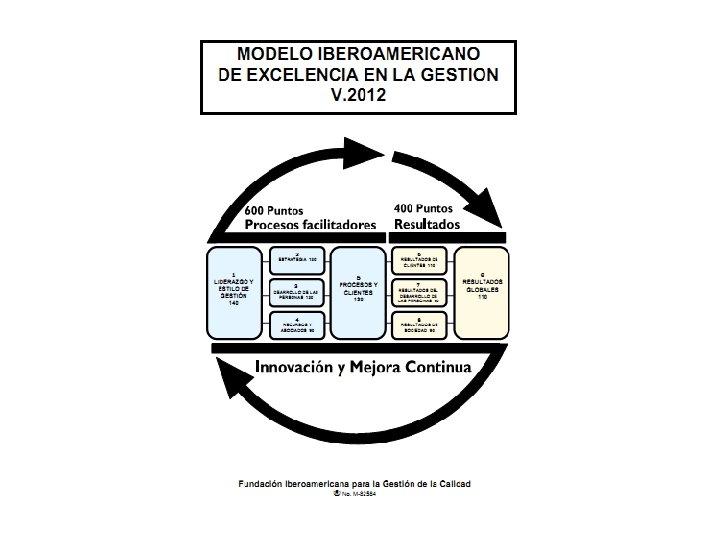 EFQM* Facilitadores Liderazgo Resultados Gestión del personal Satisfacción del personal Planificación Satisfacción del usuario Procesos Gestión de otros recursos Responsabilidad social Innovación y aprendizaje * Evaluation Framework for Quality Management European Foundation for Quality Management Resultados del desempeño