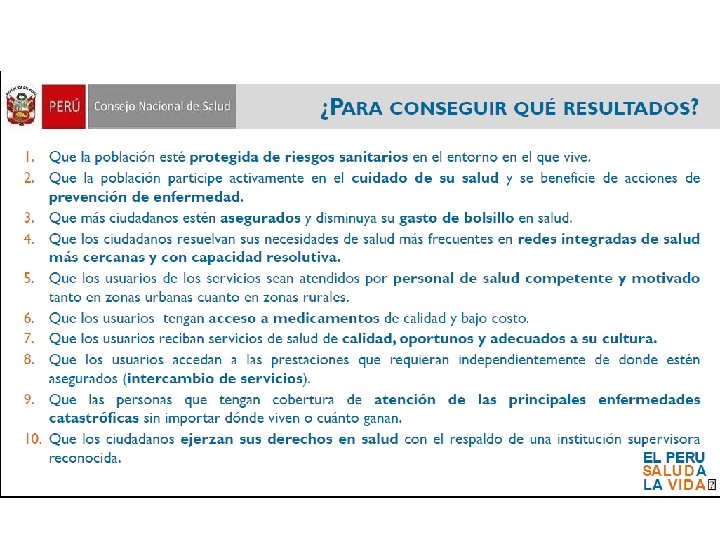 Política Nacional de Calidad en Salud Con respecto a la Ciudadanía Duodécima Política : Los Ciudadanos ejercen y vigilan el respeto a su derecho a la atención de salud con calidad y se corresponsabilizan del cuidado de su salud, la de su familia y la comunidad ……