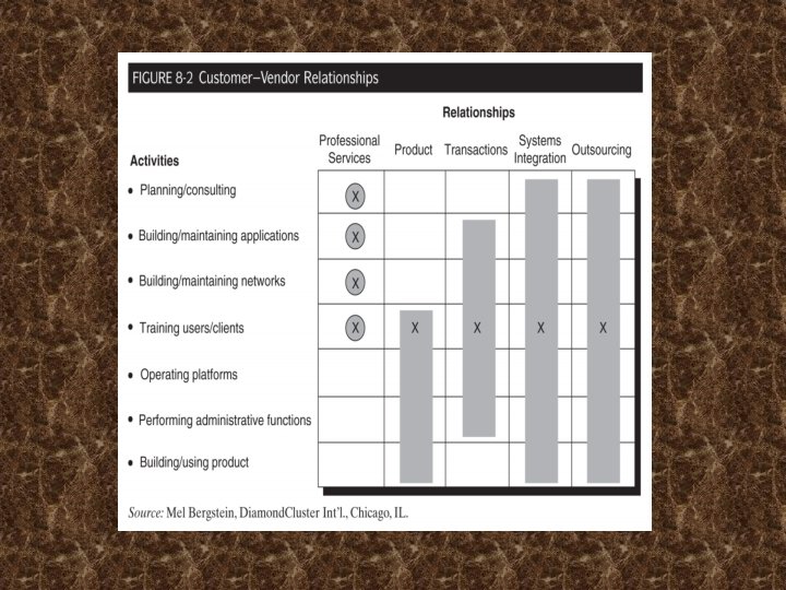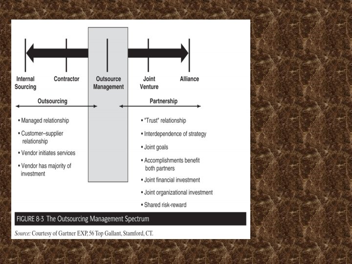 El outsourcing IS Funciones: Cambio de las relaciones clienteproveedor • Las relaciones se han expandido desde la compra de los servicios profesionales, a la compra de productos y transacciones, a la integración de sistemas, a la externalización - el enfoque más liado a la contratación En esta evolución: CIOs han perdido cada vez más el control Más actividades entregados a los extranjeros Los proveedores asumen más riesgos A medida que avanzan a (opciones) de la derecha de la figura 8 -2 Aumentar los márgenes del proveedor Nuevamente = a la derecha Los riesgos también mejoran: No se deje "Nada de nada", y Importancia de elegir el proveedor adecuado es más importante