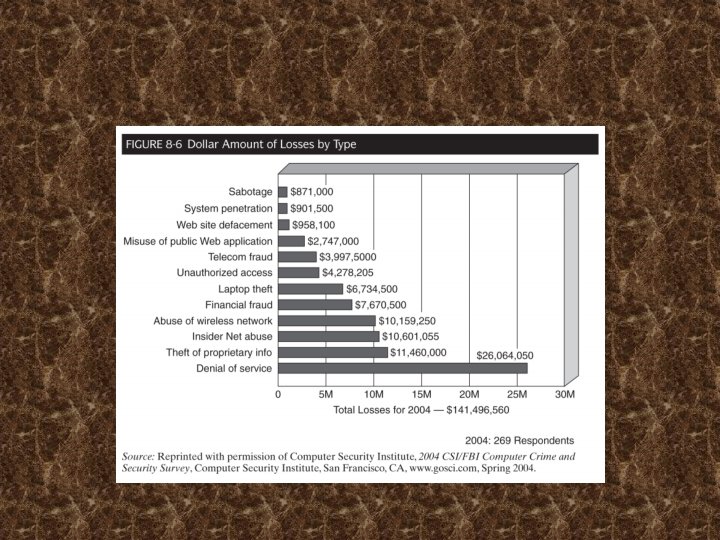 Información de Seguridad cont. • Seguridad de la información se ha convertido en un tema importante de la gestión, y no tiene respuestas claras • Es demasiado costoso para proporcionar toda la seguridad que una empresa quiere, y la realización de controles de seguridad en los paquetes requiere mucha potencia del procesador, lo que puede ralentizar el rendimiento • Incluso con el mundo de la seguridad técnica de clase, la dirección debe asegurarse de que todos los empleados sigan las políticas de seguridad, porque las empresas son sólo tan seguro como su eslabón más débil. De hecho, ese eslabón más débil podría ser un proveedor o contratista que tiene seguro a los sistemas de la empresa, sin embargo, tiene poca seguridad de su propia © 2006 Barbara C. Mc. Nurlin. Published by Pearson Education. 8 -62