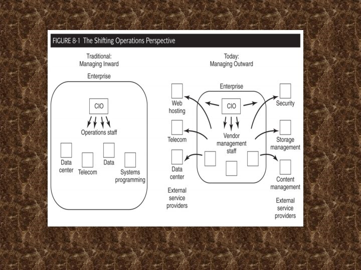 Introducción cont. • El cambio más importante en las operaciones es el cambio de punto de vista hacia la gestión de las operaciones (Figura 8 -1): Tradicionalmente - gestión interna, es decir, el personal de operaciones propias de una gestión Hoy en día - como probablemente signifique gestión externas = gestión de relaciones con (externos) los proveedores de servicios Outsourcing de los proveedores de servicios de TI que se han apoderado del día a día de trabajo operativo En algunos casos Regreso al futuro? Los beneficios no se dieron cuenta Gastos inesperados - $ y de otra manera