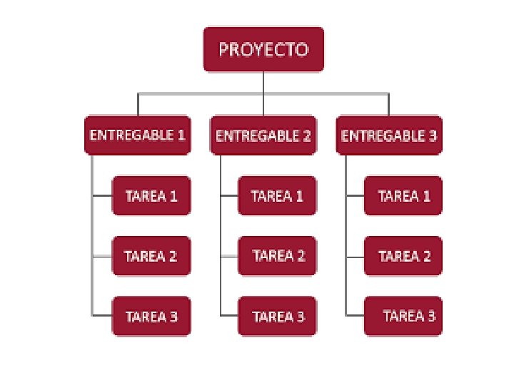 Descomposición jerárquica orientada al entregable Destinados a cumplir los objetivos y crear entregables ESTRUCTURA DE DESGLOSE DE TRABAJO Permite organizar y definir la totalidad del proyecto Cada nivel descendiente representa una definición más detallada del trabajo