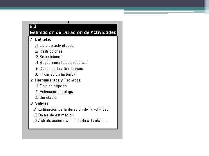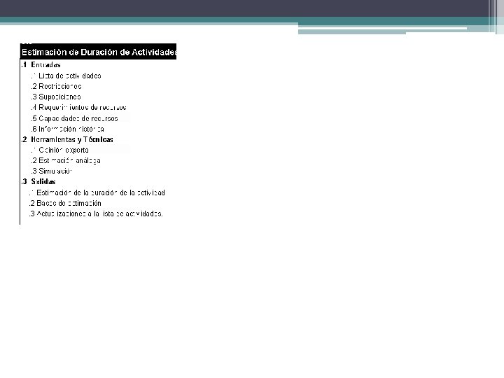 • Entradas a la Definición de Actividades • Estructura de desglose de trabajo. La estructura de desglose de trabajo es la entrada primaria para la definición de actividades. • Declaración del alcance. La justificación del proyecto y los objetivos del proyecto contenidos en la declaración del alcance deben ser considerados de manera explícita durante la definición de las actividades • Información histórica. La información histórica (que actividades fueron realmente requeridas en proyectos similares previos) deberá ser considerada durante la definición de las actividades. • Restricciones. Las restricciones son factores que van a limitar las opciones del equipo del proyecto. • Suposiciones. Las suposiciones son factores que, para los procesos de planeación, serán consideradas como verdaderas, reales, o ciertas. Las suposiciones generalmente involucran algún grado de riesgo y serán normalmente una salida del proceso de identificación de riesgos.