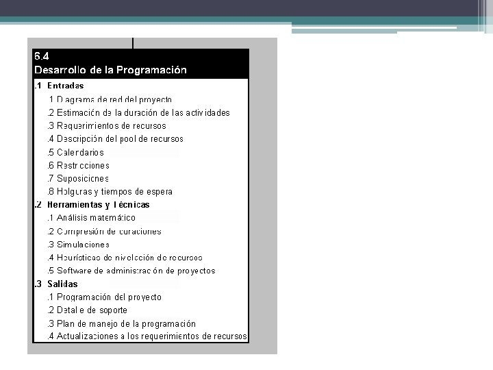 Desarrollar el Cronograma • Es el proceso que consiste en analizar la secuencia de las actividades, su duración, los requisitos de recursos y las restricciones del cronograma para crear el cronograma del proyecto.