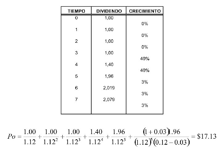 Valoración de acciones con crecimiento errático Consideremos el caso de una empresa tenga un crecimiento errático de dividendos durante algún tiempo finito, seguido por una tasa de crecimiento normal para siempre en el futuro. Para calcular su precio, utilizamos la siguiente fórmula: Una empresa espera tener un dividendo de $1 para los próximos 3 años, después de desarrollar algunos proyectos espera que sus dividendos crezcan en un 40% durante 2 años. Después se espera que la tasa de crecimiento sea del 3% anual para siempre. El rendimiento requerido para las acciones es del 12%. ¿cuánto vale una acción hoy?