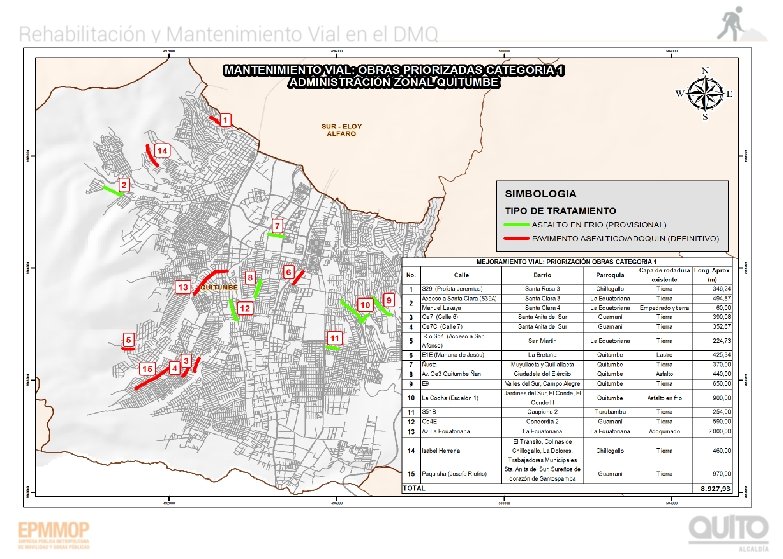 ADMINISTRACIÓN ZONAL QUITUMBE COSTO APROX. TOTAL USD 1, 993, 478. 61 TRATAMIENTO No. 1 2 Calle Desde S 29 Andrés (PROFETA Apóstol X: 493250. 79 JEREMIAS Y: 9969852. 38 ) 2. 1. Acceso a Manuel Lavaya X: 490827. 11 Santa Y: 9967962. 53 Clara (S 39 A) 2. 2. S 39 A X: 490827. 11 Manuel Y: 9967962. 53 Lavaya Hasta Barrio Oe 12 G X: 422995. 17 Santa Rosa 3 Y: 9970039. 34 Longitud Barrio Capa de Pendiente Trazado Afevtaci Agua Alcantari Red Parroquia Aprox. Ancho (m) Regulari rodadura Estado (%) Vial ones Potable llado eléctrica (m) zado exixtente Chillogallo Tiene Estudios COSTO APROXIMADO (USD) Tratamiento Mantenimient Provisional o (Asfalto en o (Asf. En Frío) Frìo) Mantenimiento rutinario (Reconformación y nivelación) No aplica 2, 492. 93 Tratamiento Definitivo 85, 867. 52 346. 24 6. 00 16 Si Si No Si Si Si Tierra Malo No Inicio de Adoquinado La Santa Clara 3 (Oe 15 D) Ecuatoriana X: 490446. 43 Y: 9968168. 43 494. 87 7. 00 4 Si Si No Si Si Si Tierra Regular No Si aplica 41, 569. 08 S 39 La X: 490866. 12 Santa Clara 4 Ecuatoriana Y: 9968002. 99 60. 00 7. 00 6 Si Si No Si Si Si Empedrado y tierra Malo No Si aplica 5, 040. 00 3 Oe 7 (Calle 6) S 54 Final dela calle Santa Anita X: 492718. 69 X: 492614. 71 del Sur Y: 9963589. 59 Y: 9963233. 36 Guamaní 390. 08 6. 00 10 Si Si No Si Si Si Tierra Malo Si No aplica 85, 608. 99 4 Oe 7 C (Calle 7) Josefa Lozano S 55 J X: 492480. 83 X: 492328. 02 Y: 9963383. 52 Y: 9963115. 86 Santa Anita del Sur Guamaní 352. 67 6. 00 12 Si Si No Si Si Si Tierra Malo Si No aplica 86, 335. 98 R o S 54 (Acceso a San Alfonso), E 1 E (Mariana de Jesús) Hasta Límite Oe 13 A Urbano, Vértice X: 491140. 49 Geográfico 034 Y: 9963837. 09 X: 490864. 43 Y: 9963852. 89 San Martín La Ecuatoriana 224. 73 7. 00 12 Si Si No Si Si Si Tierra Regular No No aplica 57, 548. 00 La Cocha X: 494968. 94 Y: 9965572. 61 La Bretaña Quitumbe 425. 34 7. 00 2 Si Si No Si Si Si Lastre Regular No No aplica 123, 065. 04 Quitumbe 370. 00 1 Si Si No Si Si Si Tierra Malo No Si aplica Quitumbe 440. 00 14. 00 3 Si Si No Si Si Si Asfalto Malo Si No aplica Carlos Villacís E 10 Valles del Sur, X: 496868, 41 X: 497277, 01 Quitumbe Campo Alegre Y: 9965211, 15 Y: 9964758, 46 650. 00 6. 00 5 Si Si No Si Si Si Tierra Malo No No aplica 5 6 S 43 X: 495195. 87 Y: 9965910. 53 Av. Quitumbe Lira Ñan Muyu Llacta y X: 494719, 19 X: 494382, 03 Quilla Llacta Y: 9966848, 92 Y: 9966910, 27 Quilla Ñan S 46 (S 47 D) Ciudadela del X: 494179, 38 Ejército X: 494058, 57 Y: 9965669, 58 Y: 9965245, 56 7 Av. Ñusta 8 Av. Quitumbe Ñan (OE 3) 9 E 9 10 La Cocha (La Chatarrera) (Escalón 1) X: 496120, 74 11 S 51 B 12 OE 4 E 13 Av. La Ecuatorian a S 48 G (Parada Barrio Venceremos) X: 496754, 43 Y: 9965140, 54 Y: 9964749, 36 E 5 A E 4 F X: 496037, 45 X: 495768, 05 Y: 9963839, 49 Y: 9963889, 50 S 48 S 49 D X: 493460, 17 X: 493589, 04 Y: 9965141, 15 Y: 9964617, 89 Av. Mariscal Miguel Uquillas Sucre X: 492601, 96 X: 493377, 24 Y: 9965308, 41 Y: 9965925, 80 14 Isabel Herrería Oe 14 D X: 491724, 98 Y: 9968744, 99 E 5 A 44, 400. 00 7, 392. 00 254, 613. 33 161, 200. 00 Jardines del Sur, El Code y El Conde III Quitumbe 900. 00 6. 00 9 Si Si No Si Si Si Asfalto en frío Malo No No aplica Caupichu 2 Turubamba 254. 00 7. 00 1 Si Si No Si Si Si Tierra Regular Si No aplica Concordia 2 Guamaní 590. 00 5. 50 2 Si Si No Si Si Si Tierra Regular No Si aplica La Ecuatoriana 2, 000. 00 5. 50 5 Si Si No Si Si Si Adoquinada Malo Si No aplica 454, 666. 67 460. 00 6. 00 10 Si Si No Si Si Si Tierra Malo No No aplica 114, 080. 00 El Tránsito, Colinas de Límite Urbano Chillogallo, La X: 491492, 54 Chillogallo Dolores, Y: 9969129, 44 Trabajadores Municipales Santa Anita 86, 400. 00 73, 490. 67 38, 940. 00