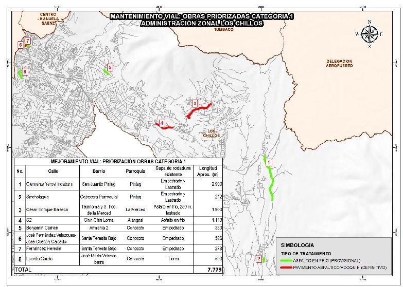 ADM. ZONAL LA DELICIA COSTO APROX. TOTAL USD 1, 280, 930. 44 TRATAMIENTO No. 1 2 3 4 5 6 7 Calle Desde Hasta Barrio Tratamiento Longitud Barrio Capa de o Ancho Pendient Trazado Agua Alcanta Red Tiene Mantenimien Provisional Mantenimien Tratamiento Regula rodadura Estado Parroquia Aprox. Provisional (m) e (%) Vial Potable rillado Eléctrica Estudios to (Asfalto en to Definitivo (m) rizado existente (Asf. En Frìo) Frío) Emilio Alvaro Bustamante Cevallos Piedras X: 500258. 3 X: 497705, 9 San José del Ponceano 826. 00 Negras 4 4 Condado Y: 9987743, Y: 9977069, 05 79 Antonio Julián Quito José de X: 500461, 7 Sucre Fernando San José del Ponceano 492. 00 1 X: 497013, 9 Daquilema Condado Y: 9988065, 1 07 Y: 9975701, 67 Oe 21 Tulipe X: 496528, 1 N: 496204, 7 Lago 9 2 Plan Techo Condado 1, 010. 00 Titicaca Y: 9989315, Y: 9988551, 35 11 N 74 D N 78 A San Enrique Laguna N: 498634, 3 N: 498414, 5 de Velasco. Yahuarcoc 7 3 Condado 1, 024. 00 Colinas del ha Y: 9988596, Y: 9989027, Norte 53 34 Malearte Machala N: 499448, 5 N: 500042, 6 Bernardo San José de 1 19 Cotocollao 724. 00 de Legarda Jarrín Y: 9986908, Y: 9987325, 97 57 Real Bartolomé Audiencia de Zamora N: 501651, 7 N: 501085, 3 Sabanilla Agua Clara Ponceano 623. 00 5 9 Y: 9986476, Y: 9986721, 07 76 Real Juana Audiencia Chuqisaca Nazacota N: 501753, 8 N: 501252, 9 Ponceano 517. 00 Puento 1 5 Y: 9986757, Y: 9986885, 53 69 LONGITUD TOTAL (m) COSTOS APROXIMADOS (USD) 5, 216. 00 7% Si Si Si Asfalto Malo No Mantenimien to rutinario No aplica (bacheo) 2, 020. 81 235, 134. 67 7. 00 7% Si Si No Asfalto Malo No Mantenimien to rutinario No aplica (bacheo) 1, 203. 68 140, 056. 00 9% Si Si Si Tierra Malo No Si aplica 8. 00 8% Si Si Si Asfalto Malo Si Mantenimien to rutinario No aplica (bacheo) 2, 863. 10 351, 893. 03 12. 00 9% Si Si Si Mantenimien to rutinario No aplica (bacheo) 3, 036. 46 182, 594. 16 7. 00 8% Si Si Si Asfalto Malo Si Mantenimien to rutinario No aplica (bacheo) 1, 524. 17 136, 572. 68 9. 00 10% Si Si Si Asfalto Malo Si Mantenimien to rutinario No aplica (bacheo) 1, 626. 22 161, 959. 90 Adoquina da y Regular asfaltada 72, 720. 00 12, 274. 44 72, 720. 00 1, 208, 210. 44