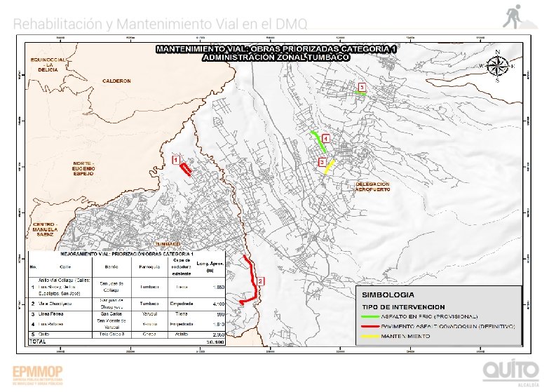 ADMINISTRACIÓN ZONAL TUMBACO COSTO APROX. TOTAL USD 2, 019, 199. 41 TRATAMIENTO No. Calle Desde Hasta Barrio DE LOS EUCALIPTO TOS S (Oe 8 D) San José (Oe 8 D) X: 511155. 2 X: 51086 de Collaqui 2 6. 49 Y: 9981285. Y: 99810 02 68. 72 Federico Miguel San juan Proaño Noboa Vía a de X: 51450 X: 514409. 8 2 Chuspiyacu 6. 68 9 Chuspiyac Y: 99751 Y: 9972049. u 97. 56 27 E-35 (Barrio Nelson Jara Rojas San Carlos) N: 519616. 3 3 Línea Férrea San Carlos N: 51913 7 6. 82 Y: 9981383. Y: 99805 78 96. 31 Antes de N 41 calle Eloy San N: 51835 Alfaro 4 Luis Pallares 9. 05 N: 519113. 8 Vicente de Y: 99832 8 Yaruqui 93. 27 Y: 9982004. 99 Anillo Vial Collaqui (Calles: Luis 1 Stacey, De los Eucaliptos, San José) 5 Calle Quito Calle E 36 Parque Tola Chica Noboa 3 2*051. 16 LONGITUD TOTAL (m) COSTOS APROXIMADOS (USD) Tratamiento Longitud Barrio Capa de o Ancho Pendient Trazado Afecta Agua Alcanta Red Tiene Mantenimien Provisional Mantenimien Tratamiento Regula rodadura Estado Parroquia Aprox. Provisional (m) e (%) Vial ciones Potable rillado Eléctrica Estudios to (Asfalto en to Definitivo (m) rizado existente (Asf. En Frìo) Frío) Tumbaco 1, 650. 00 7. 00 1% Si Si No Si Si Si Tumbaco 4, 100. 00 5. 00 2% Si Si No Yaruqui 7. 00 1% Si Si No Si Si Si Yaruqui 1, 610. 00 8. 00 1% Si Si No Si Si Si 4% Si Si No Si Si Si Checa 890. 00 2, 051. 16 8. 24 9, 479. 32 Tierra Regular Si No aplica 337, 985. 02 No Mantenimien No aplica to rutinario 833, 666. 67 Regular No Mantenimien to rutinario (Reconformac No aplica ión y nivelación) Empedrad Regular a SI Si aplica Si No aplica Empedrad Malo a Tierra Regular 7, 476. 00 154, 560. 00 692, 987. 72 7, 476. 00 154, 560. 00 1, 864, 639. 41