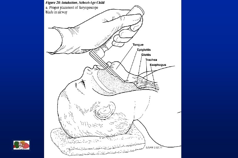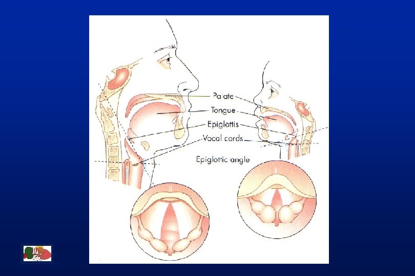 Voies Aériennes Supérieures le larynx de l’enfant est plus antérieur , plus haut situé (C 3 -C 4) la langue est plus large obstruction VAS par la chute en arrière de la langue à l’induction anesthésique. l’épiglotte en oméga et difficile à contrôler avec la lame. le plan d’insertion des cordes vocales est oblique en bas et en avant , l’extrémité de la sonde butte souvent sur leur commissure antérieure ( pas d’ITB Naso. T à l’aveugle) sténose sous-glottique: cartilage cricoïde inextensible, région propice aux oedèmes et sténose post intubation