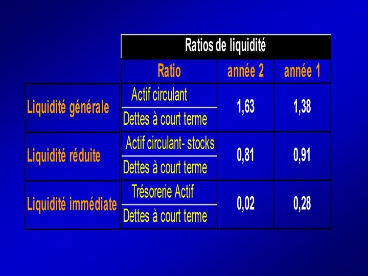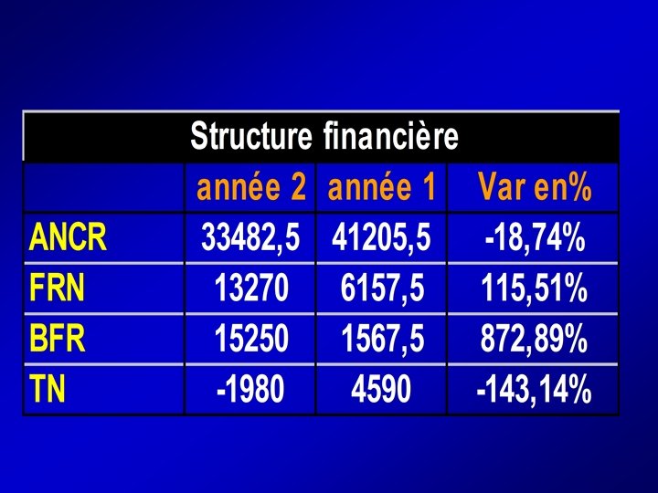 Autres ratios de structure financière Ratio Année 2 Niveau de capitalisation ANCR Total actif 38, 27 % Autonomie financière DLT CP 0, 99 Taux de couverture du BFR FRN BFR 0, 87 Année 1 50, 12 % 0, 60 3, 93